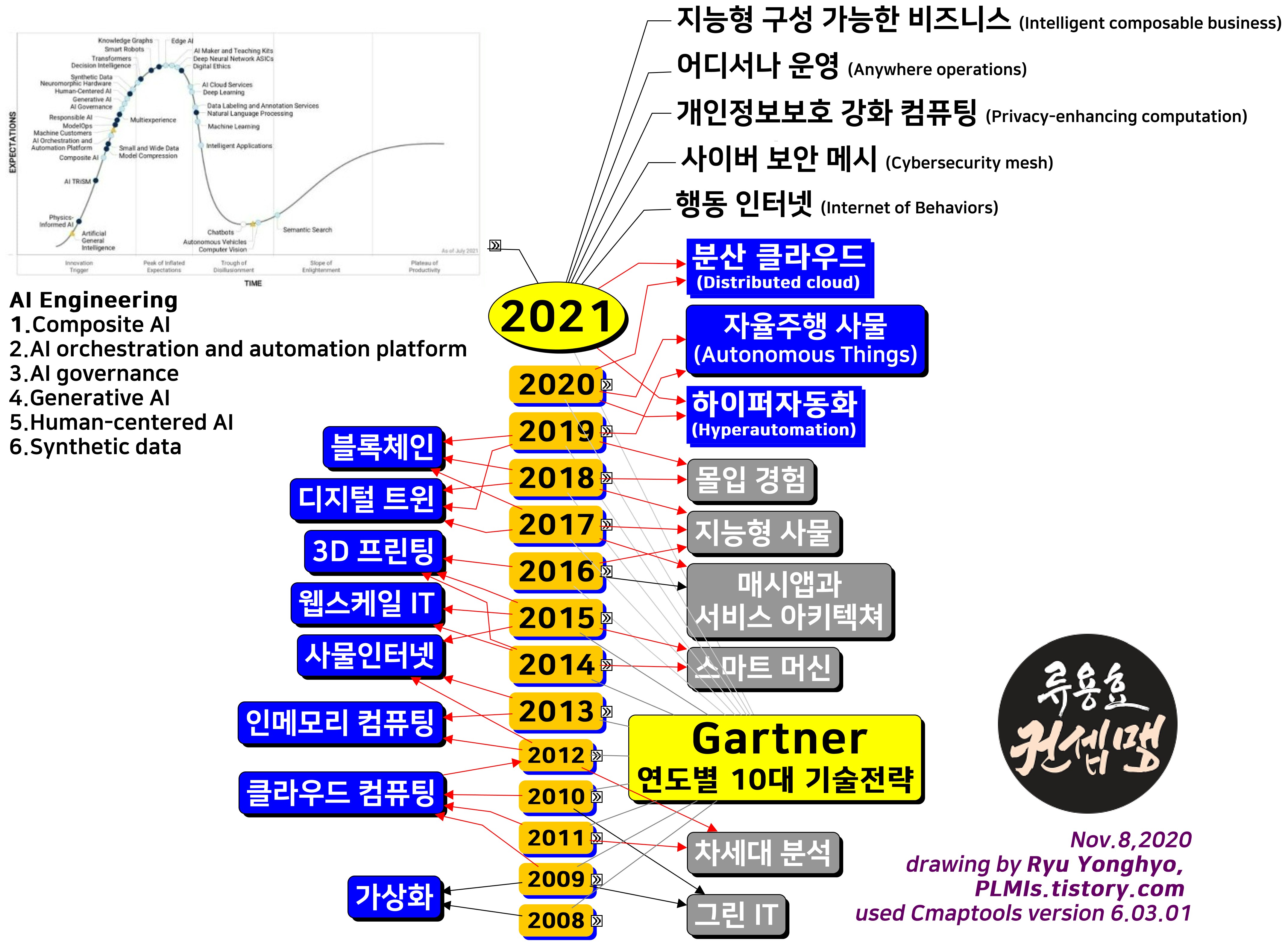이상으로 지난 10년간 가트너 10대 기술전략를 기반으로 기술의 흐름 분석(콘셉트 맵 이용)을 통해서 주요기술들의 변화되는 모습과, 나아가 Product Data Analytics까지 살펴보았다. 기술의 발전을 부정할 수는 없지만, 각 기업마다 산업특징, 문화, IT 성숙도 등을 감안할 때, 기술(명품)을 어떻게 잘 받아들여서 나(회사)에게 맞는 옷을 입느냐는 지속적인 업데이트와 관심이 필요할 것이다.