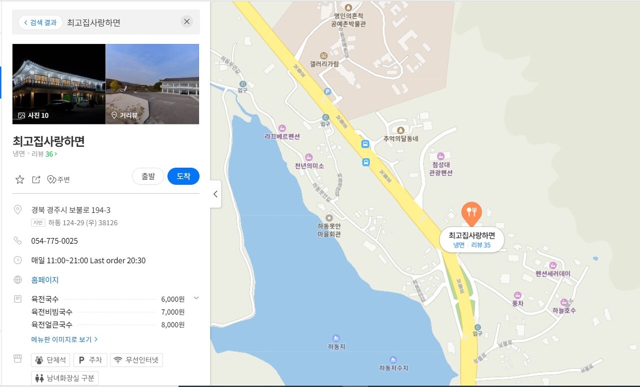 카카오맵, 네이버앱에서 경주 국수 라고 검색하면