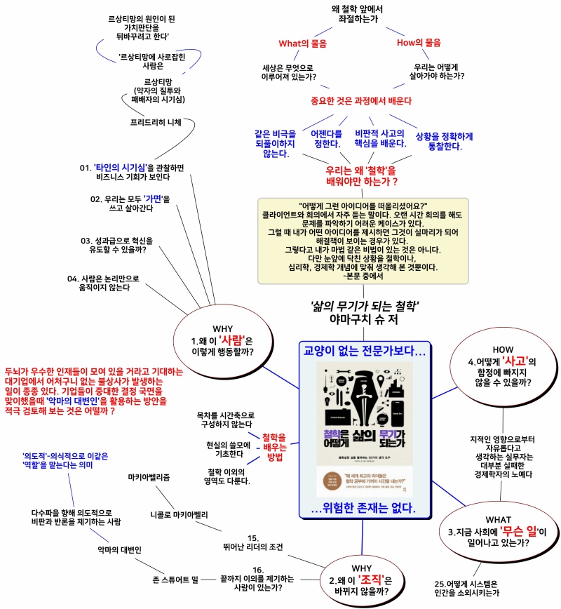 저자는 WHY(사람, 조직), WHAT(사회(무슨 일)), HOW(사고)로 나누어 50가지의 철학 메시지로 철학이 삶의 무기가 되는 내용을 전개한다. 대부분 서양 철학자의 사례를 들어 풀어내었는데, 우리에게 친숙한 동양적 사고 “36계”도 서양의 처세술에도 유사하게 나타난다.