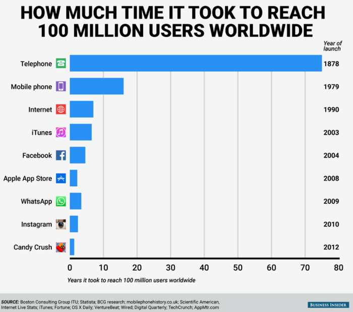 1854년 안토니오 무치에 의해 세계 최초로 개발된 전화기(전기식 음성 전달 장치)는 1920년대에 사용자가 1억명을 돌파했으며, 1973년 마틴 쿠퍼(모토롤라)에 의해 처음 만들어진 휴대전화는 1980년대 후반에 1억명 사용자에 도달했다. 페이스북, 앱스토어, 왓츠앱 등 플랫폼 기반의 솔루션들을 보면 1억명 도달 주기가 점점 빨라지는 것을 알 수 있다.