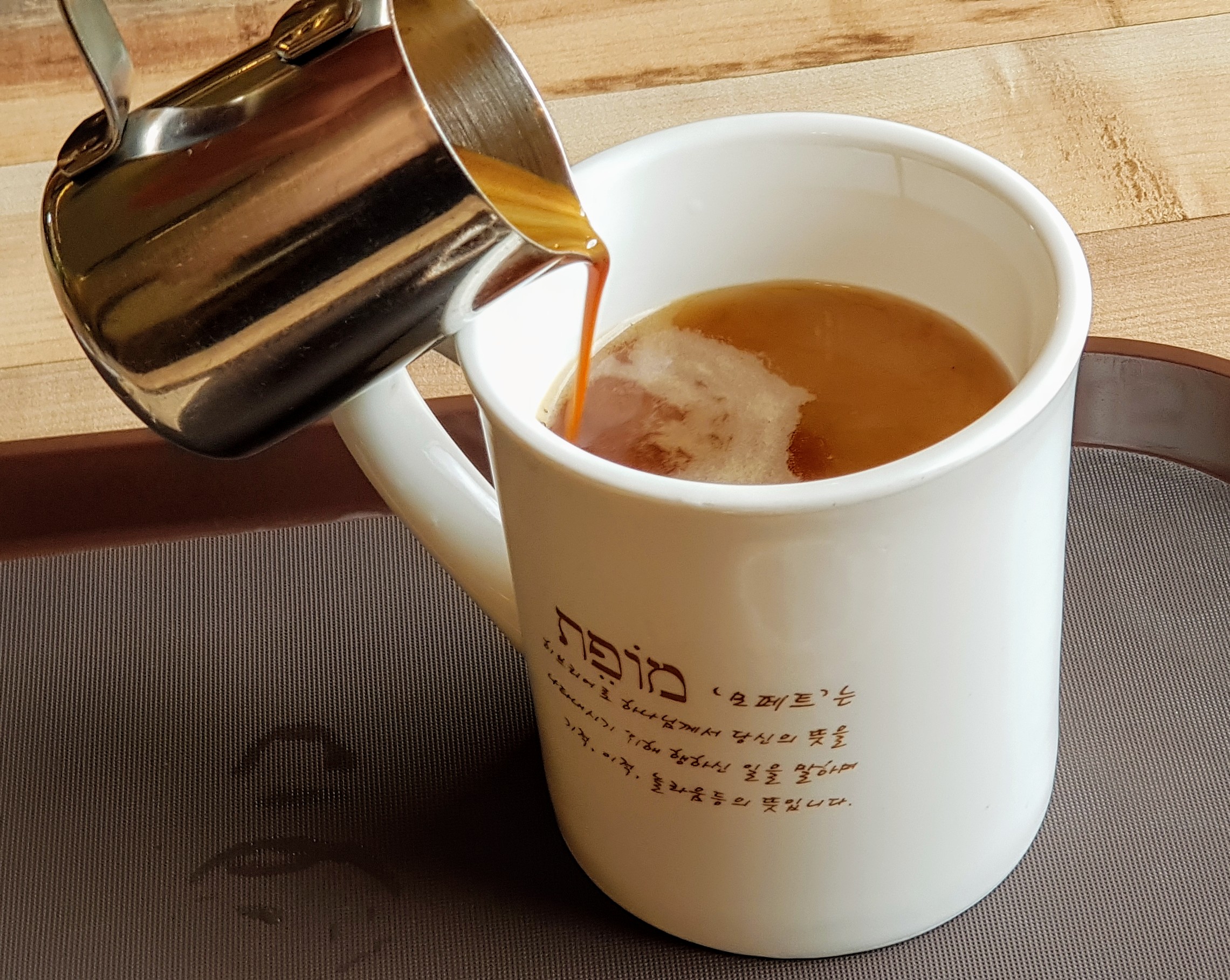 따뜻한 물이든 컵과 에스프레소가 따로 나온다.