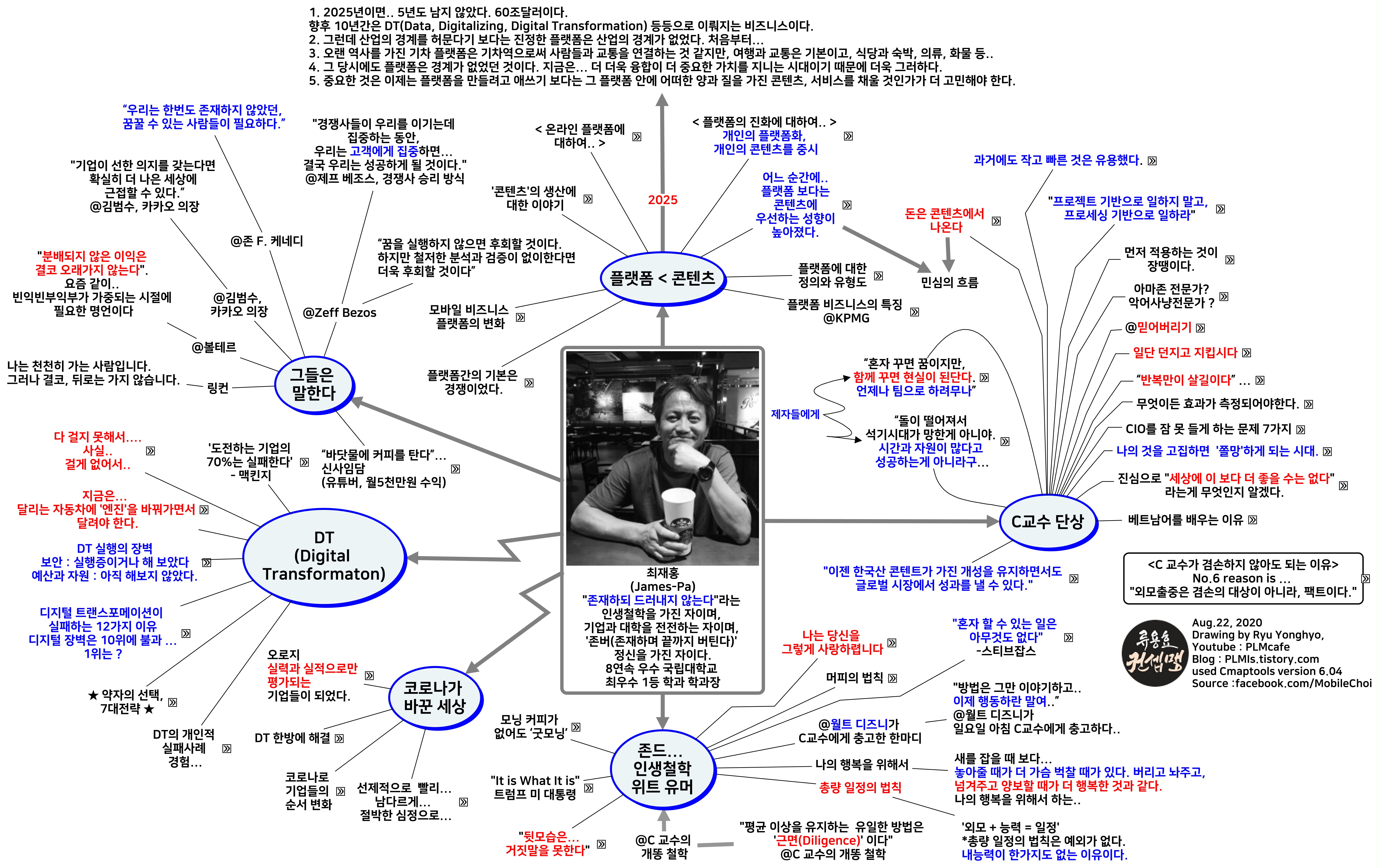 페이스북으로만 뵈었던 C 교수님의 글만 모아도 엄청난 인사이트를 얻었으리라…. C 교수님의 페이스북 담장글을 모아봤다. C 교수님은 4가지 패턴을 가지고 계신다. 역시 유머와 위트 사이에 끼워진 세계 최고의 악어 사냥 전문가다운 솔직 담백 공유의 팩트와 전략들을 모아서 콘셉트 맵의 핵심 기능인 내용 정리 기능을 활용해서 순전히 필자가 좋아하는 방식으로 정리했다.