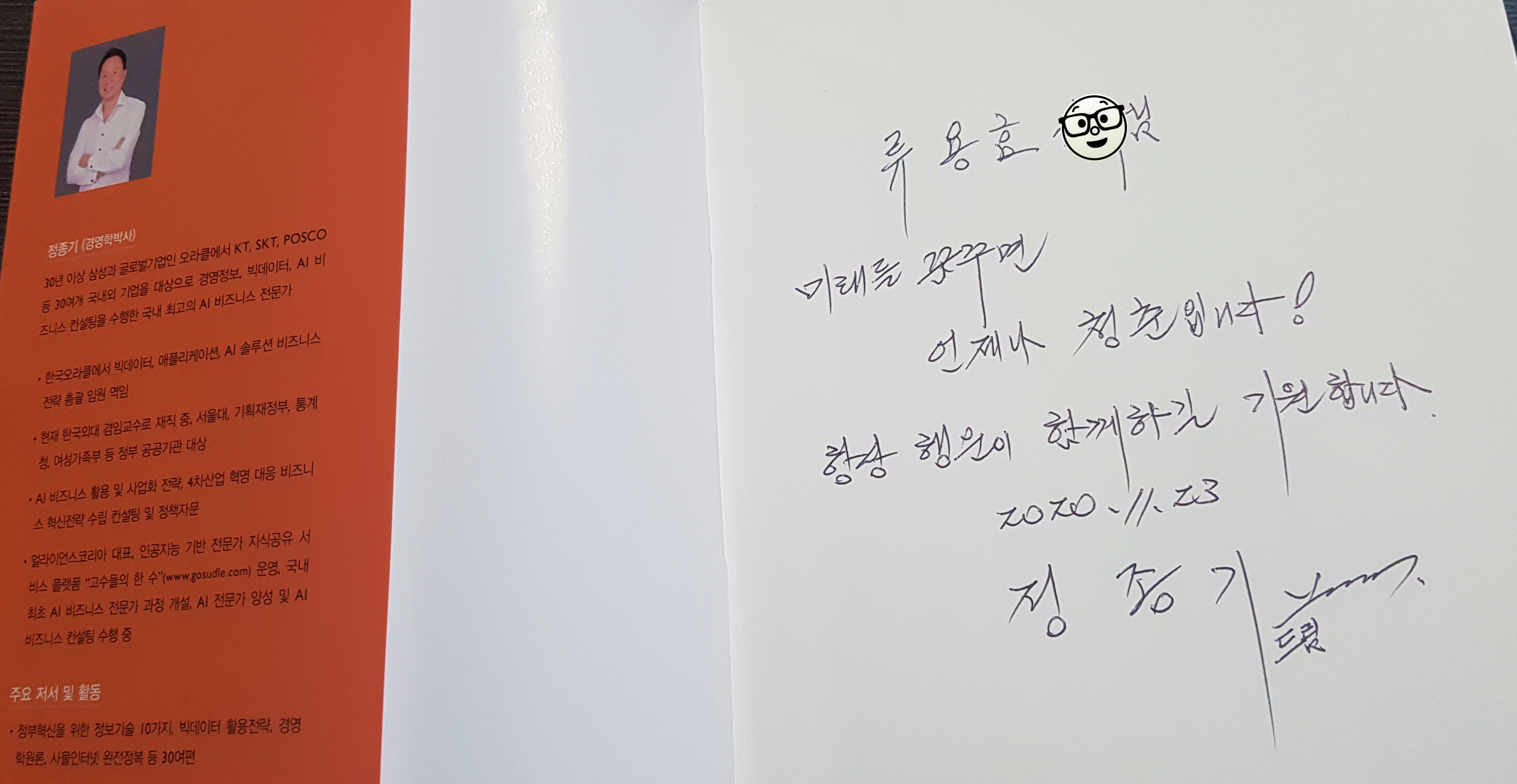 그 동안 비즈니스(사업, 컨설팅), 강연, 칼럼 등을 하시면서 틈틈이 작성한 글들을 모아서 ‘인공지능 완전정복’이라는 책을 출판하셨다. 책의 내용이 궁금했다. 필자가 아는 인공지능의 상식과 책에서 얘기하고 싶은 것들과 비교하고 싶은 욕심도 있었다. 그리고 필자의 프로젝트 100인 라이프맵에 한 분으로 모시고자 냉큼 ‘서평맵을 쓰고자 책을 보내주십사’ 연락을 드렸다. 멋진 친필 글씨와 함께 책이 도착했다.