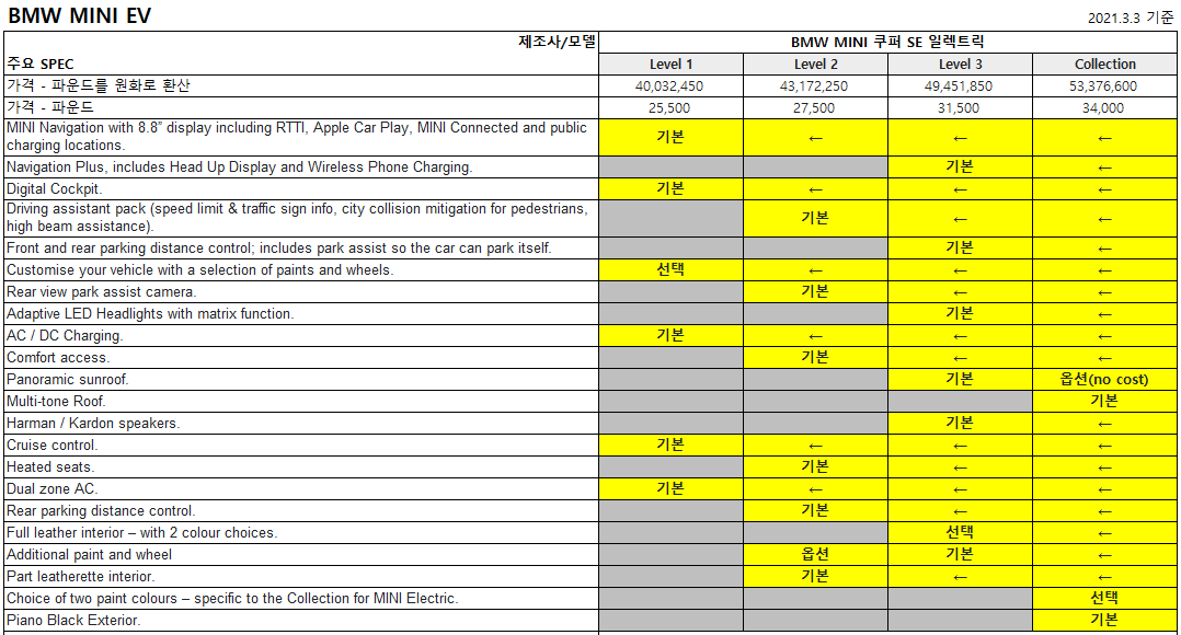 미니 전기차는 미니의 옵션들로 구분되어 있다.