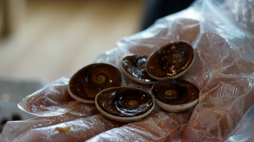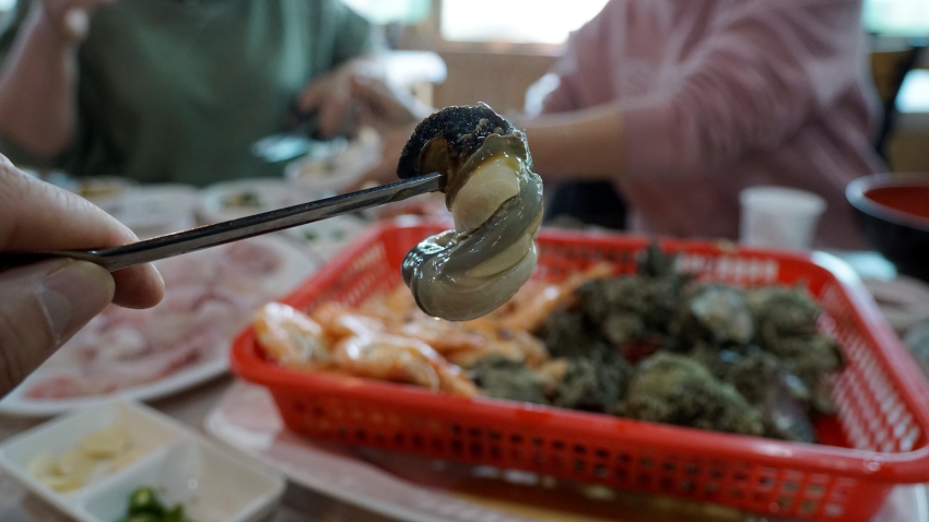 대게에 사용하는 도구로 뿔소라의 내면을 쏙 빼서 먹기 직전...