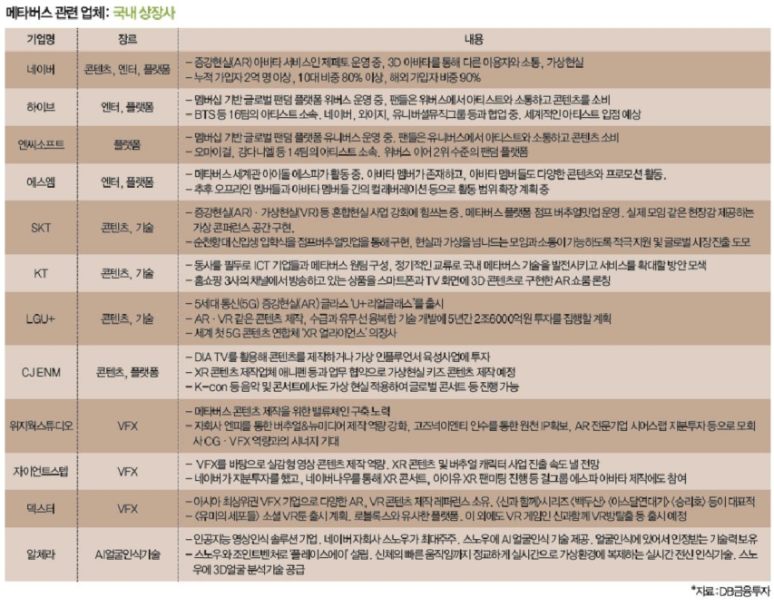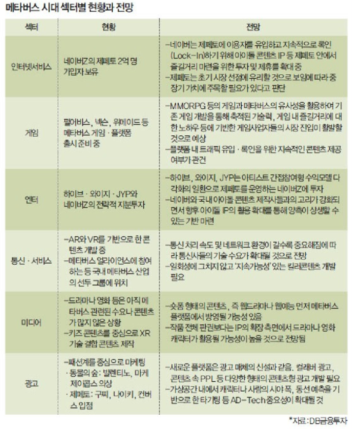 메타버스 관련 기업 분석 (자료:DB금융투자)