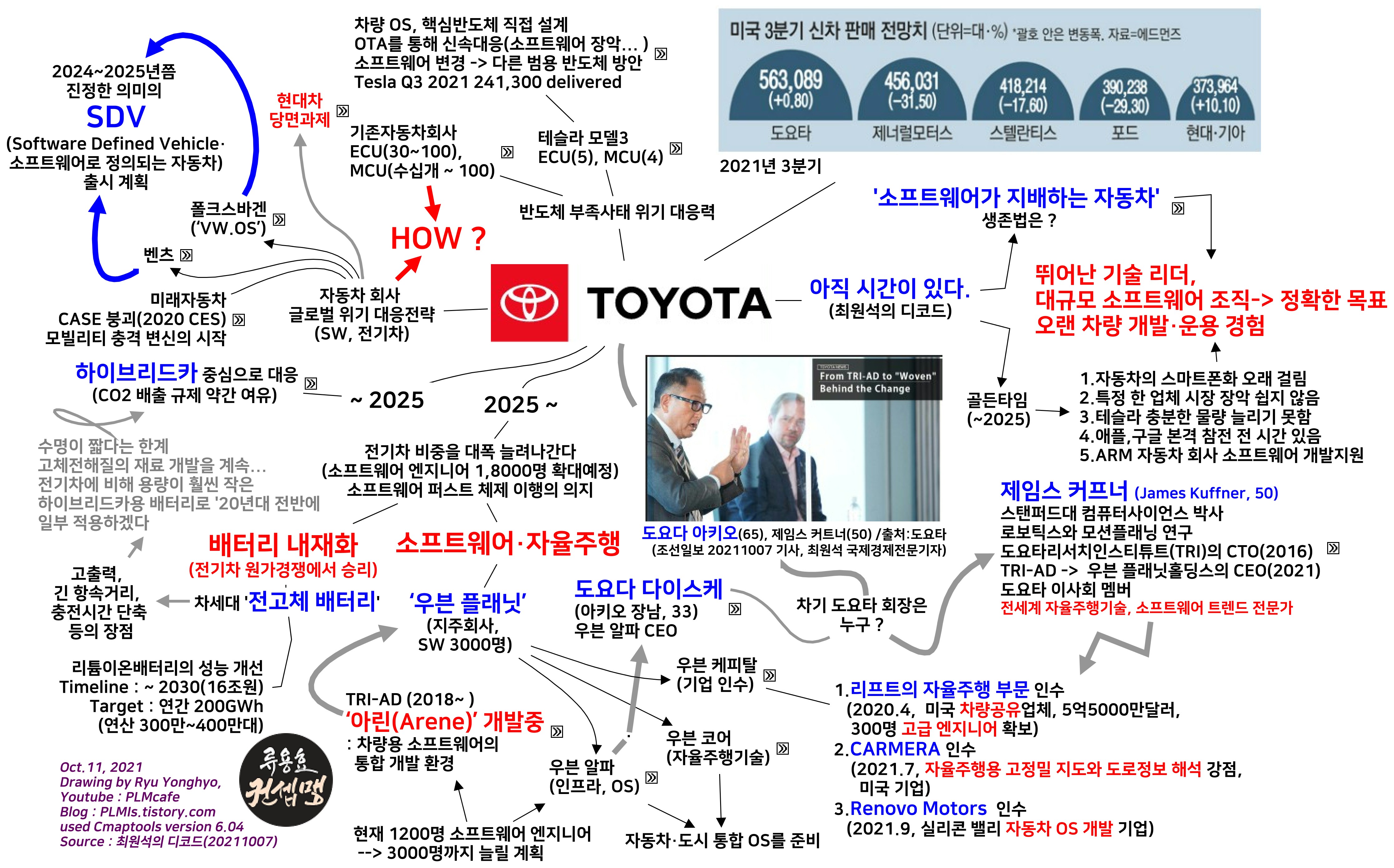 최원석 기자(국제경제전문기자/조선일보)의 디코드(decode, 부호화된 데이터를 알기 쉽도록 풀어내는 것. 흩어져 있는 뉴스를 모아 세상 흐름의 안쪽을 연결) 기사중에 TOYOTA 전기차 방향성을 잘 풀어낸 기사를 소스삼아 TOYOTA 전기차맵 만들었다.