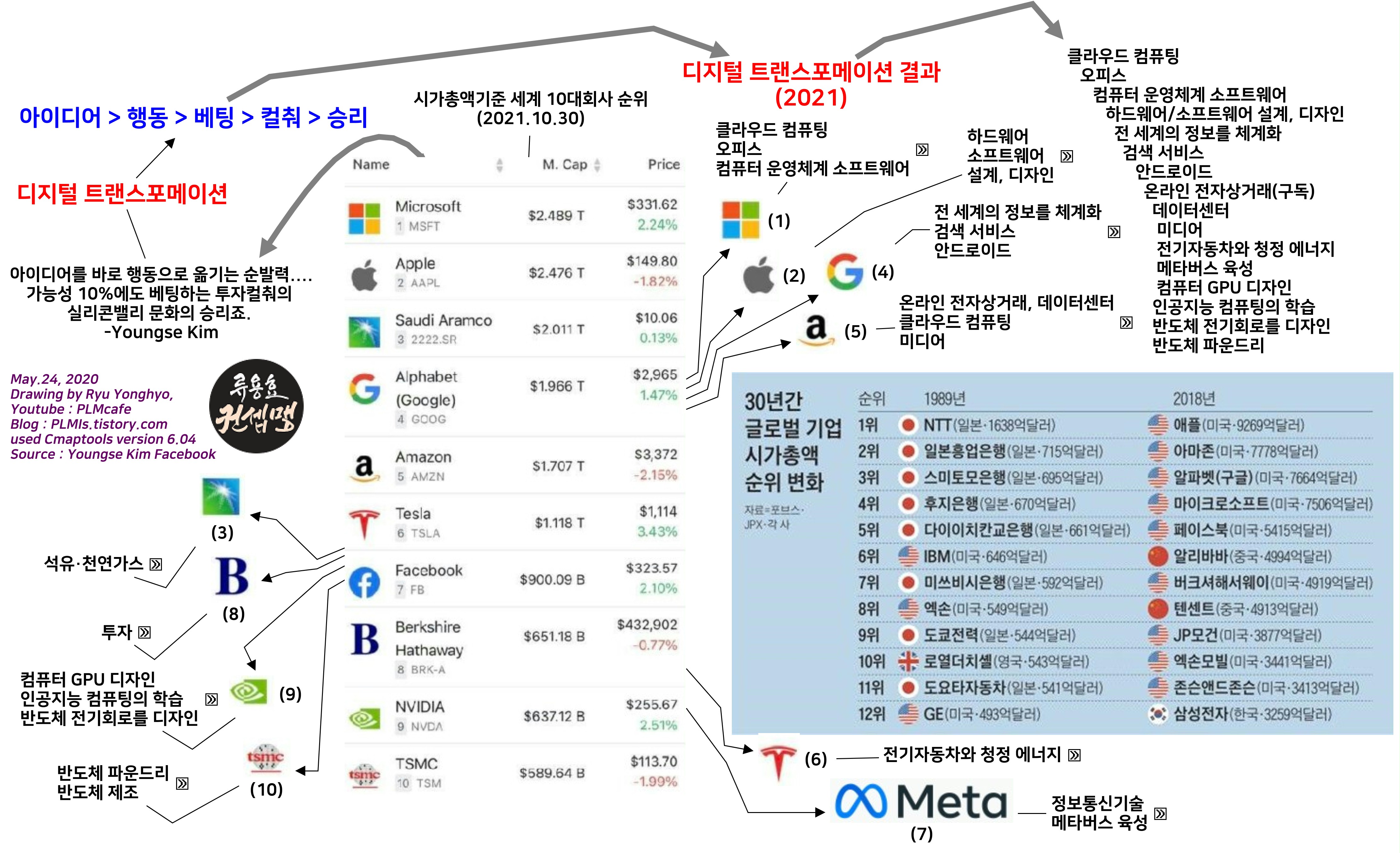 5)세계10대 기업중 사우디의 사우디아람코, 대만의 TSMC를 제외한 8대기업이 모두 미국의 기업이며 이들중 8위를 기록한 버크셔이어헤더웨이를 제외하면 마이크로소프트/애플/구글/아마존/테슬라/페이스북/엔비디아 등 7개 기업이 모두 미국의 테크기업이다. 디지털 트랜스포메이션이 현재 진행중인 미래로의 대변혁시대를 미국의 기술이 이끌고있는 것이다.