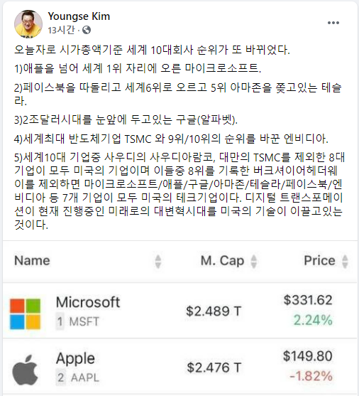 김영세회장님(youngse Kim, 이노디자인)의 페북에 언급된 시가총액 글을 보고