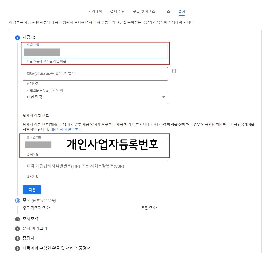 세금 ID의 개인 이름은 통장(결재수단)영문이름과 동일하게 등록하면 된다.