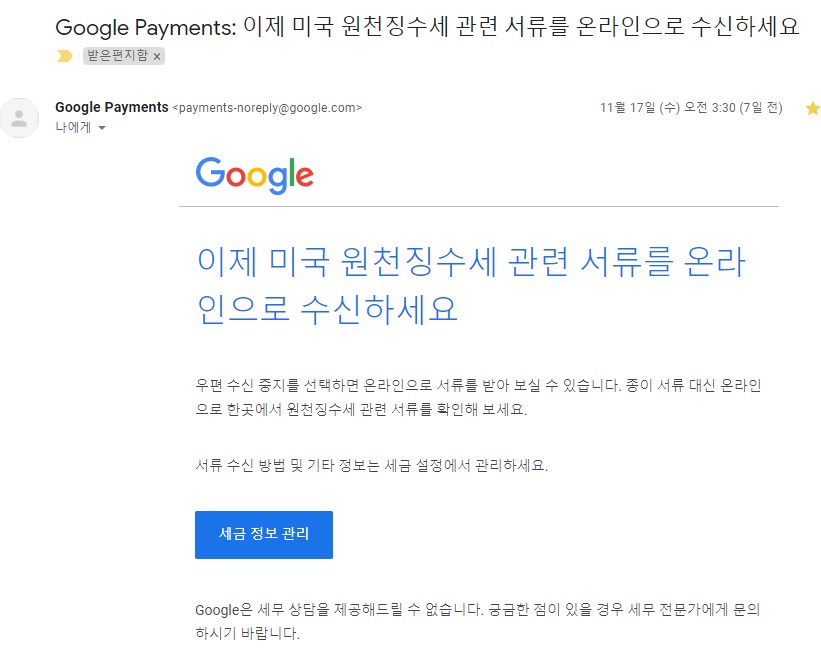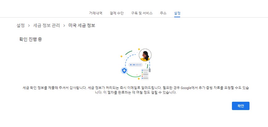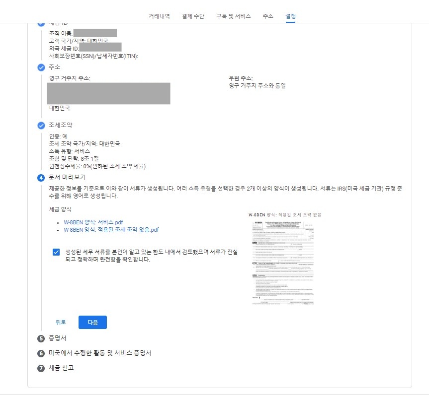 다시 구글 세금 정보 관리 화면으로 돌아가서 진행해 보자.