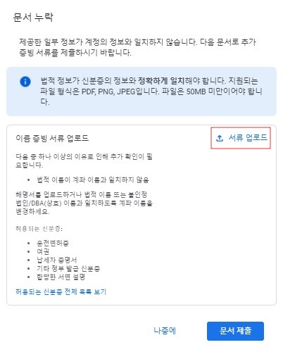 본 서류들은 모두 영문이지만, 구글 등록된 이름은 한글이라 증빙 서류를 업로드 해야 한다.