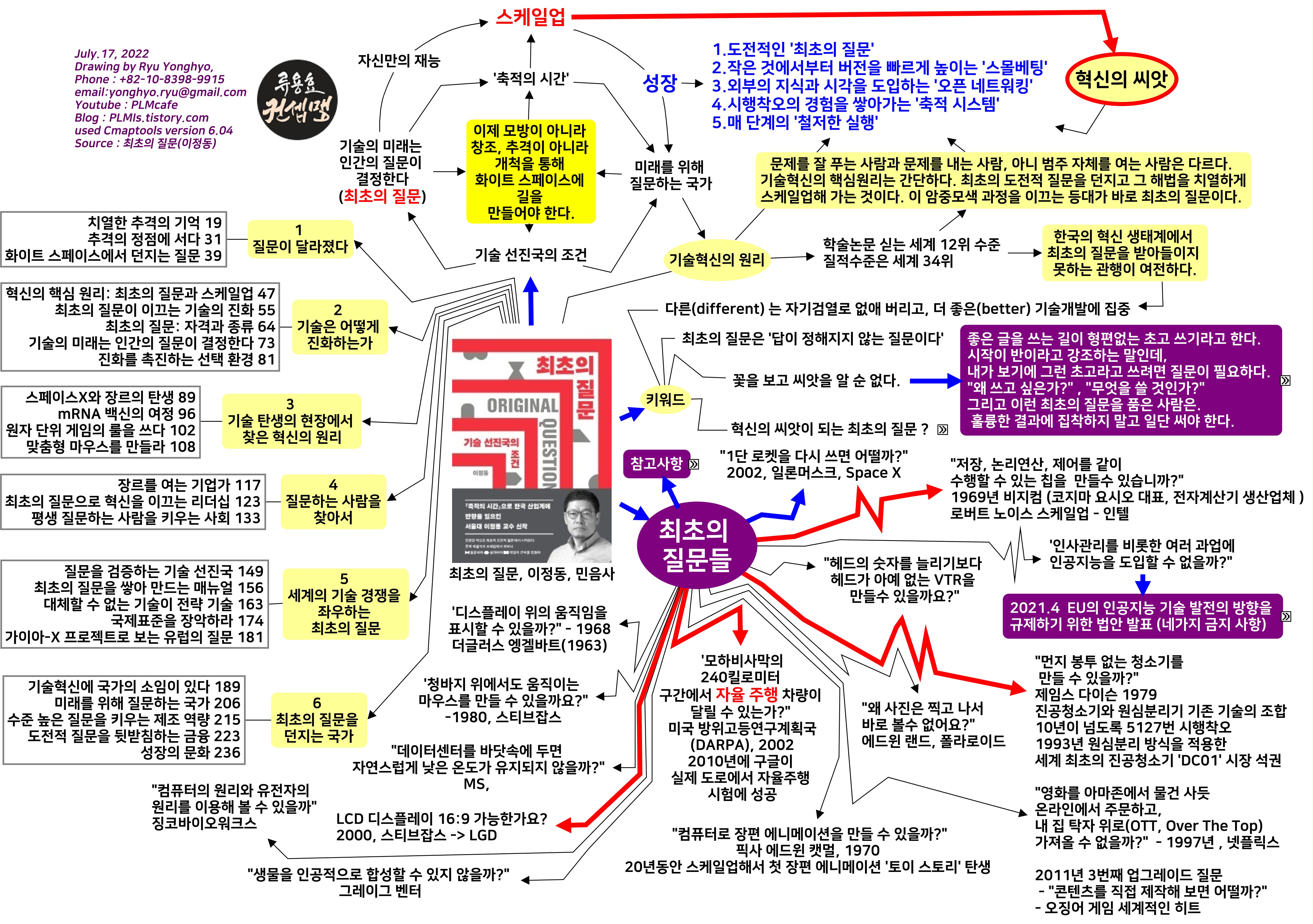 책에서 언급된 최초의 질문들을 모아봤다. 2022년 현 시점에서 바라볼 때 최초의 질문들은 어떤 느낌일까 ? 이정동 교수님은 책 ‘최초의 질문’에서 최초의 질문 후에 이어지는 스케일업에 의미를 두고 있다. 그 과정은 2년 혹은 심지어 12년동안 지속된 회사도 있다. 그들은 어떻게 디지털 트랜스포메이션 을 이룰 수 있었을까? 이 책을 손에 잡는 순간 최초의 질문 스토리텔링 속으로 빠져 들어간다. 보다 자세한 내용은 책과 아래 서평맵에서 한장으로 간략히 요약을 해 놓았다.