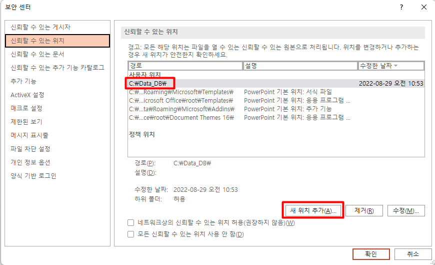 하위폴더까지 허용을 클릭하고 난 후 파워포인트를 재실행하면