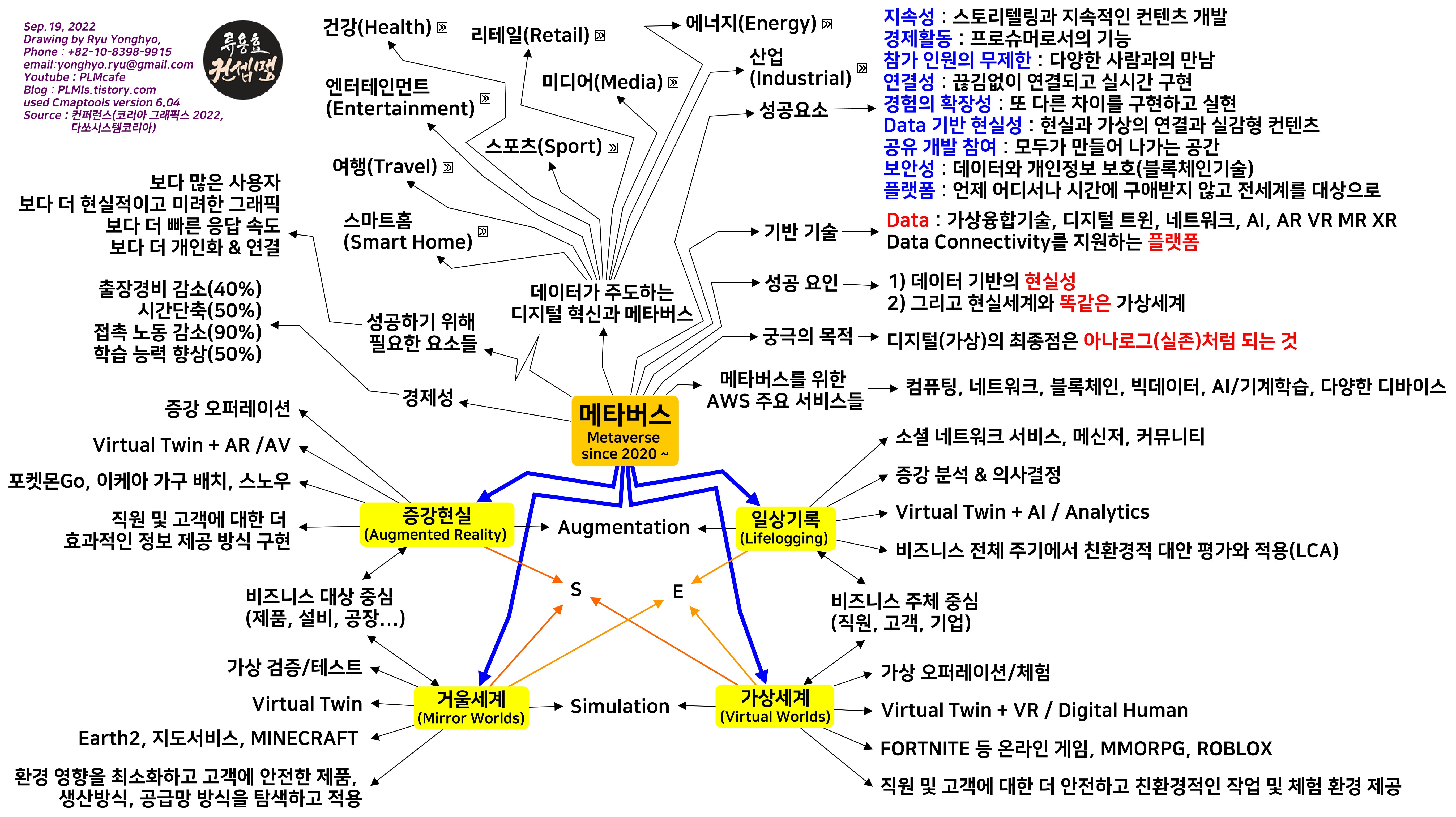이 글을 쓰는 이유는 최근 주요 컨퍼런스(다쏘시스템코리아 3DEXPERIENCE 2022, 코리아그래픽스 2022)에서 메타버스 관련 흥미로운 내용들을 들으며 구체적으로 정리해 보고 싶었다. 클라우드가 아마존에 의해 세상에 나온 후(2006), 본격적으로 시장에서 핫하게 등장할때(2012)에도 그랬었다. 그후 10년이 지난 지금 클라우드는 시대의 대세로 받아들인다. 메타버스도 앞으로 10년 뒤에는 시대의 대세로 받아들여 질 것 같다는 생각이 든다. 클라우드보다는 좀 더 앞당겨질 듯하지만, 시대의 대세가 되기 위해서는 스마트 글래스로 세상을 편하게 모든 디지털 정보를 쏟아낼 때 보편화 되지 않을까? 최근 컨퍼런스에서 흥미로운 강연의 내용을 중심으로 ‘나의 메타버스 란’ 형식으로 정리해 본다. 각자의 생각이 다를 수 있으니, 각자 생각을 정리해 보는 것도 의미 있으리라 본다. 메타버스의 정체를 하나 하나씩 들여다보자. 메타버스의 성공요인과 성공요소 들이 나오는 것을 보니 시장에서는 메타버스의 윤곽을 잡은 듯하다.