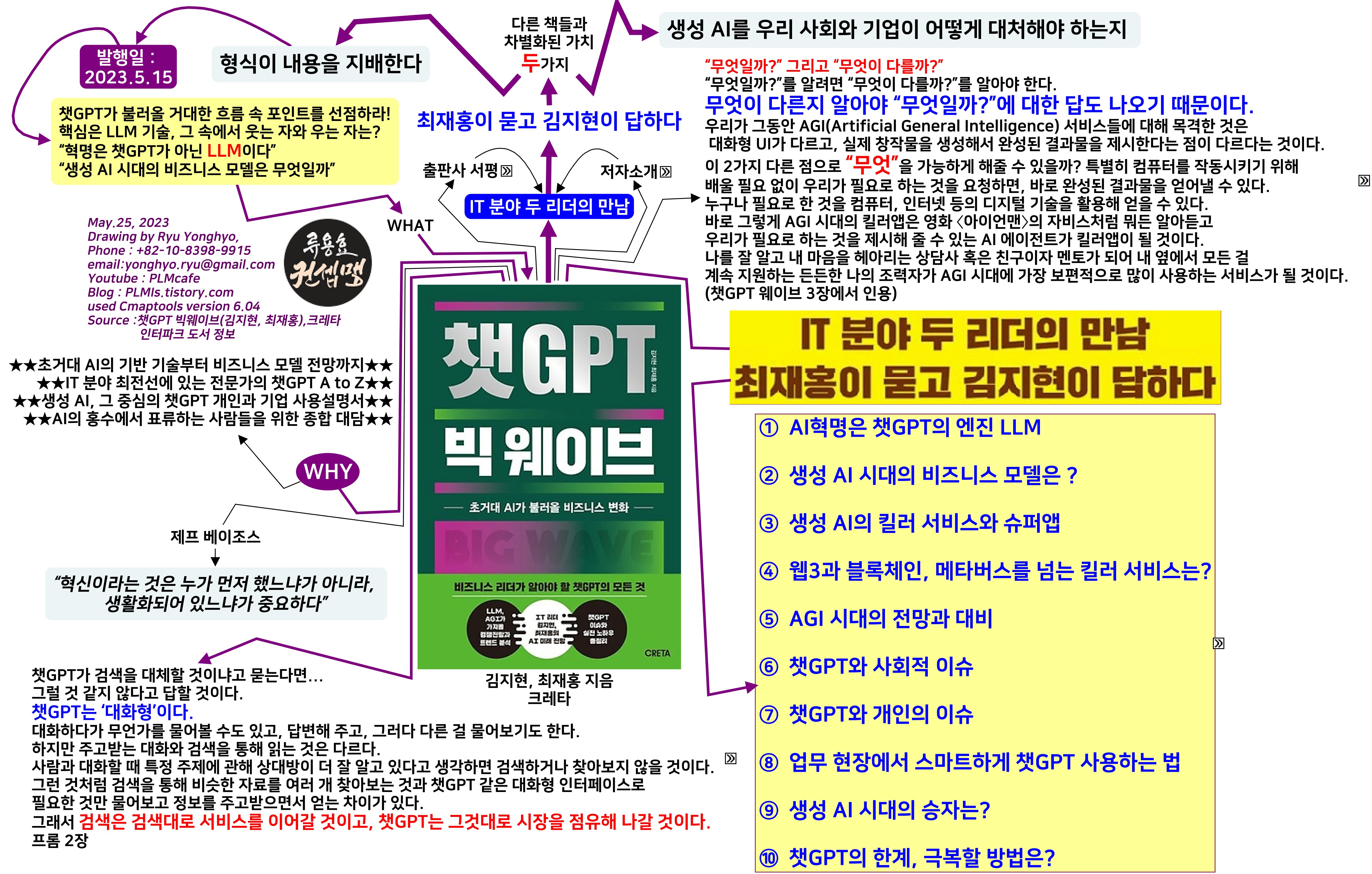 책이 출간되기 전에 저자의 책 소개를 바탕으로 서평맵을 만들었다. 그리고 좀 더 명확하게 이해하기 위해 저자분의 목소리에 귀를 기울여 보았다. 형식이 내용을 지배하는 것과 생성 AI가 우리 사회와 기업이 어떻게 대처해야 할지에 대해 어떤 메시지를 줄지 한장의 맵으로 정리해 보았다.
