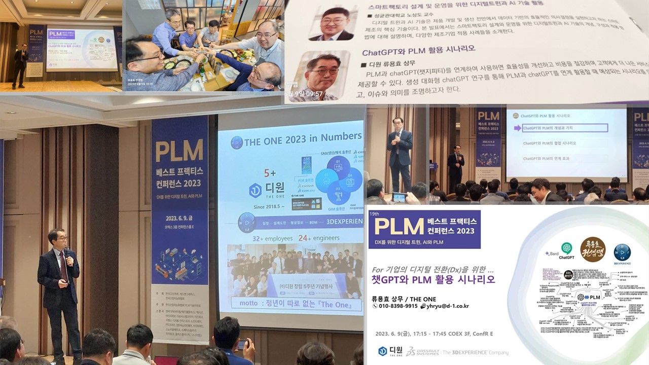 디원이란 회사 소개에서 부터 1.chatGPT와 PLM의 개념과 가치 , 2.chatGPT와 PLM의 협업 시나리오, 3. chatGPT와 PLM의 연계 효과 순으로 발표 하였다. 협업 시나리오는 배터리, 타이어, 고객 서비스에 대한 시나리오를 소개했다.
