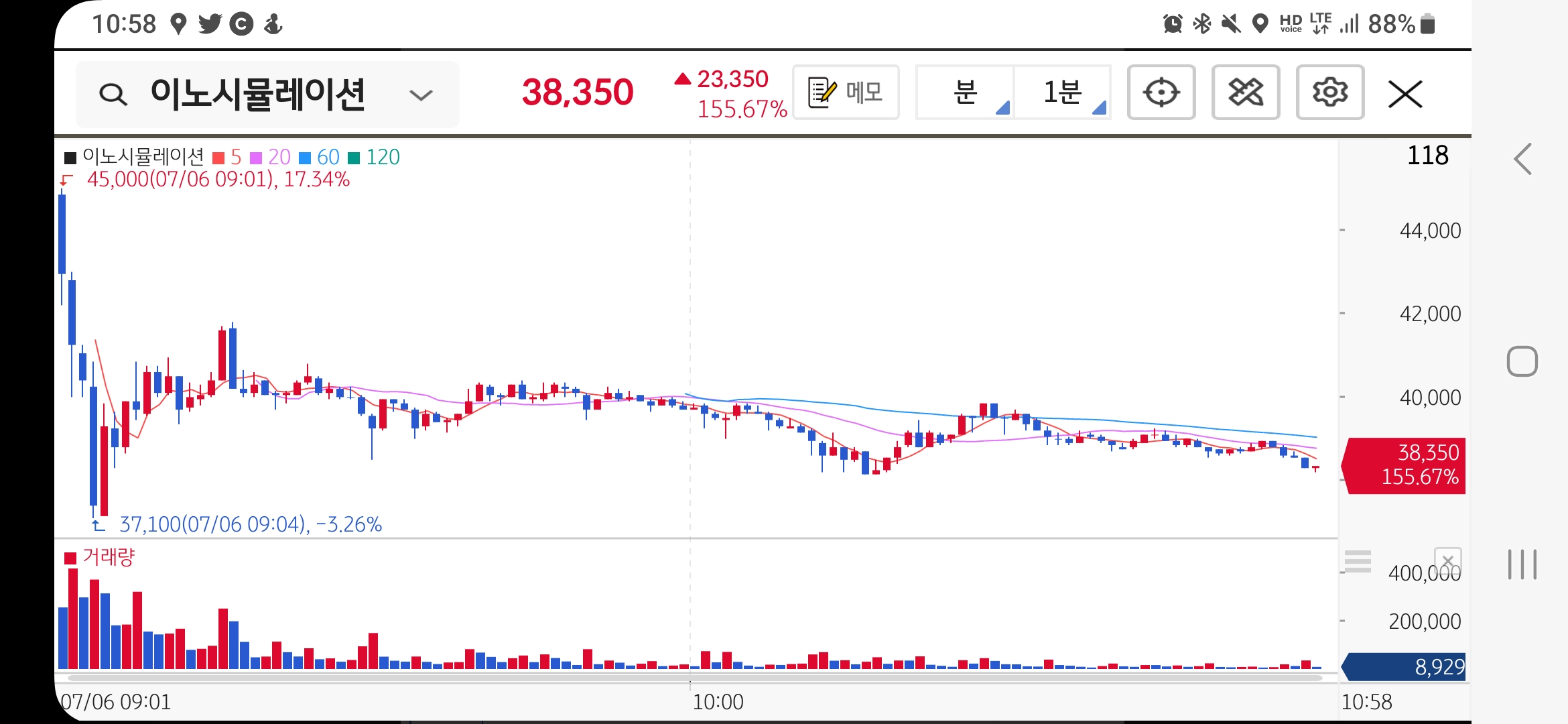 이노시뮬레이션은 장 개시 직전에는 공모가(1만 5000원)보다 25000원 오른 4만 원에 거래되고 있었다.