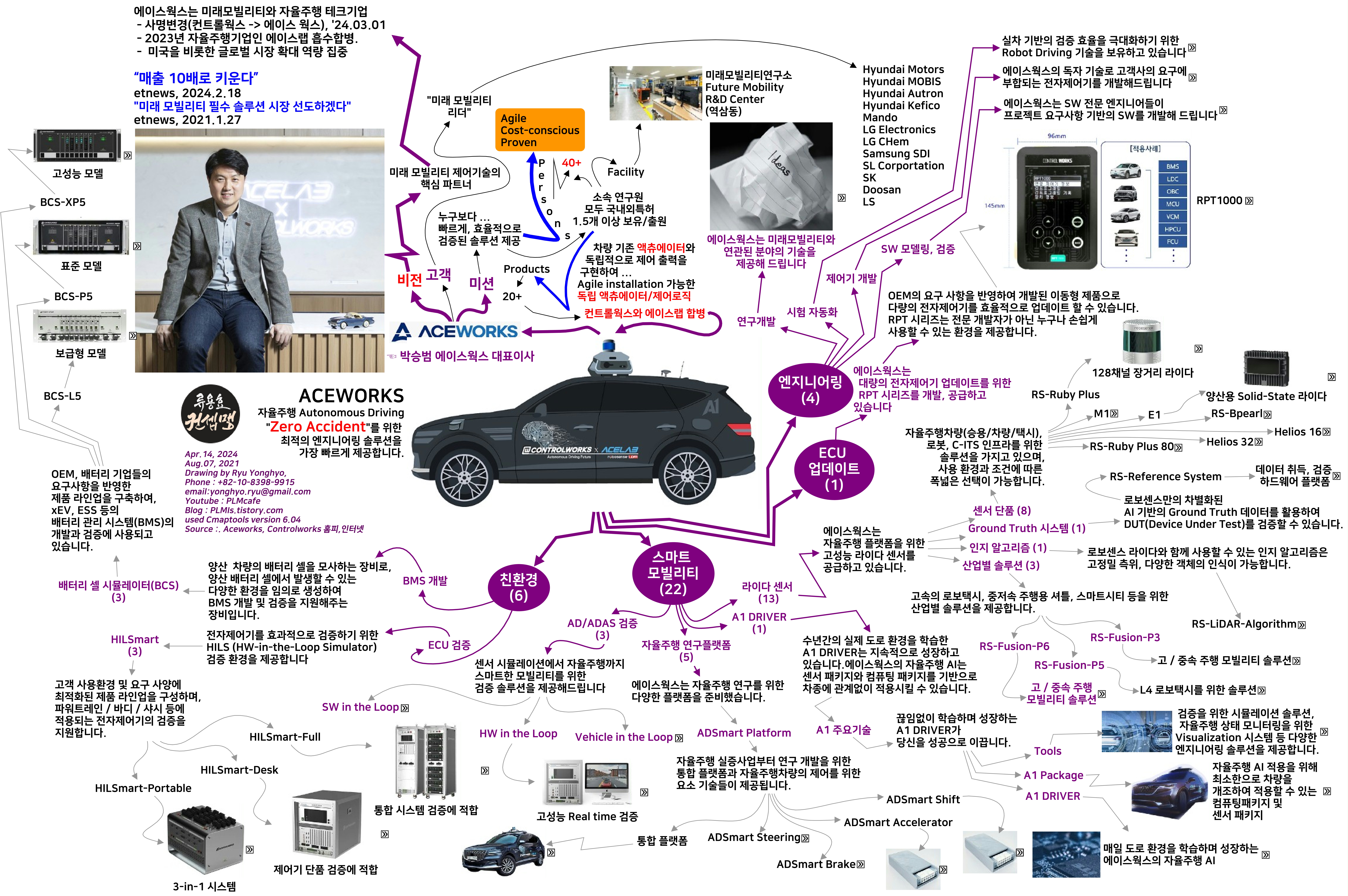 에이스웍스(ACEWORKS)는 수송기계 관련 제어시스템, HILS 시스템, 자율주행 솔루션 등을 제공하는 미래모빌리티 전문 솔루션 기업입니다. 컨트롤웍스와 자율주행 전문 스타트업 ACELAB이 합병하여 탄생했습니다.
