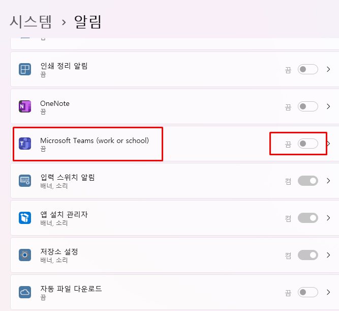 윈도우 11 - 시작 - 시스템 - 앱및 기타 보낸 사람이 전송한 알림에서