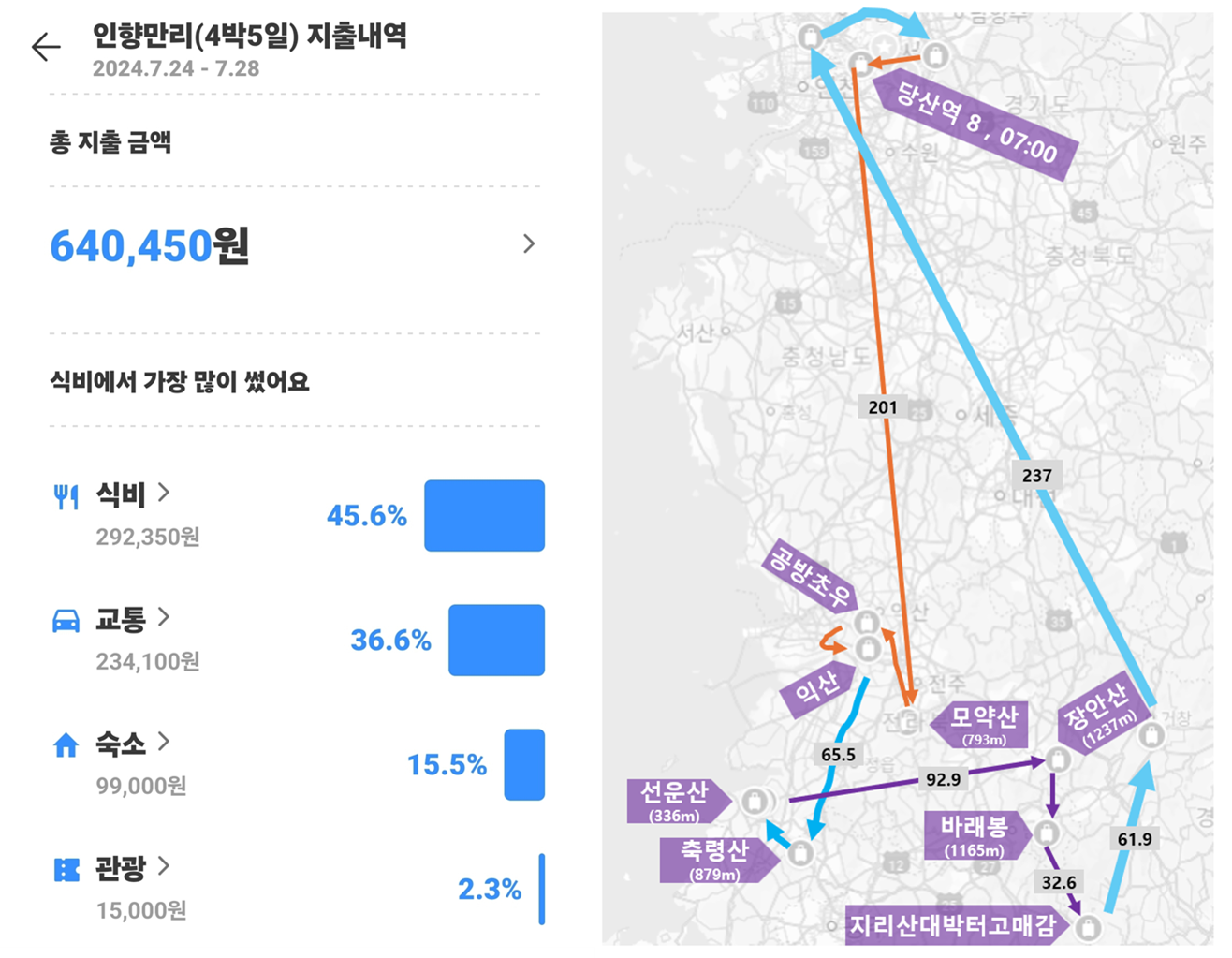 이번 여행은 2024년 7월 23일에서 7월 28일까지 4박 5일 동안 5개의 산(모악산, 선운산, 축령산, 장안산, 바래봉)을 등산하고, 하동 악양의 지리산대박터고매감에서 하룻밤을 보내며 4대 사찰(쌍계사, 칠불사, 화엄사, 천은사)을 투어하는 일정이었습니다. 이번 여행의 전체기획은 붓(정신)으로 길을 여는 고등학교 친구인 서예가 장천 김성태와 동행 하였고, 나는 이동(차)의 길을 열어 곧곧을 누비며 1337km를 달렸습니다.