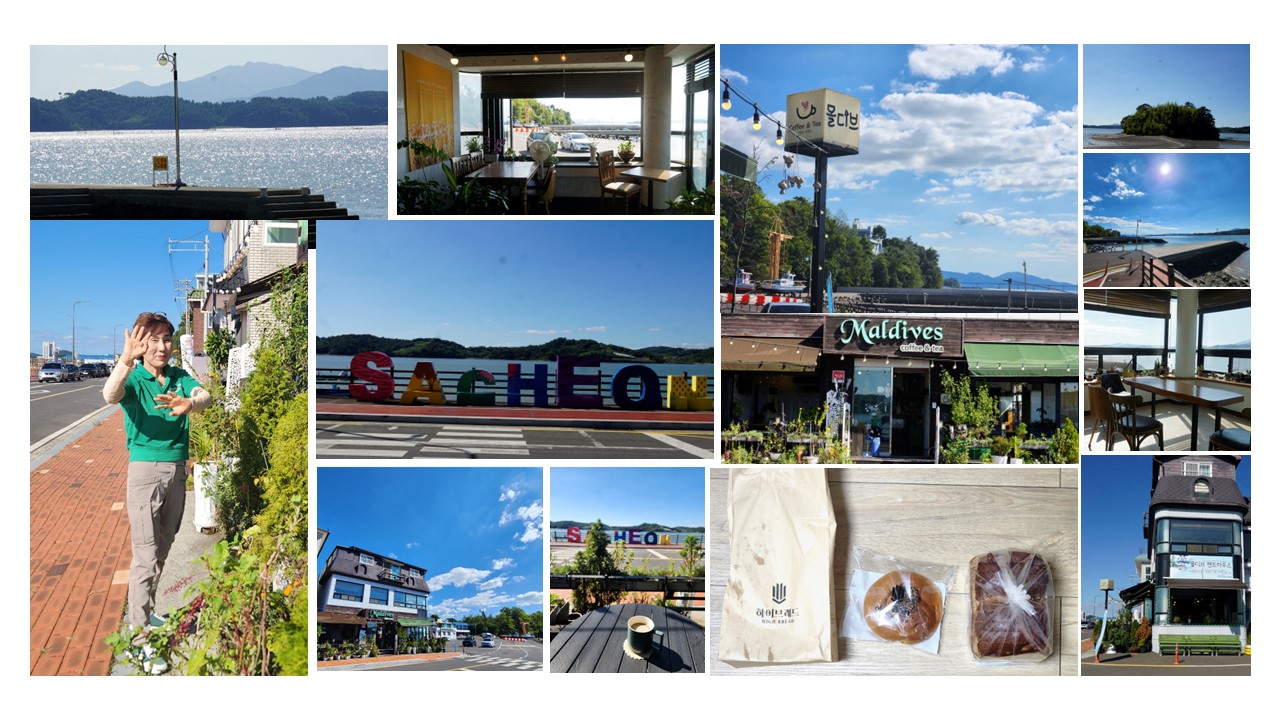 사천으로 가는 길에 대포항을 지나 무지개도로를 드라이브 하며 종포를 지나 선진리항으로 들어오니, 몰디브 카페가 눈에 들어 온다. 그리고 그 옆 돼지국밥 집과 2층 예전 숙소도 보인다.