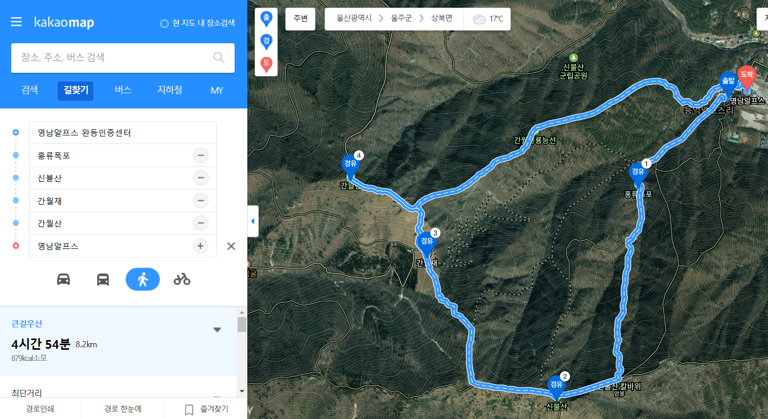 영남알프스 완등인증센터에서 출발 - 홍류폭포 - 칼바위 - 신불산 - 간월재 - 간월산 - 원점 회귀로 총 14km ,