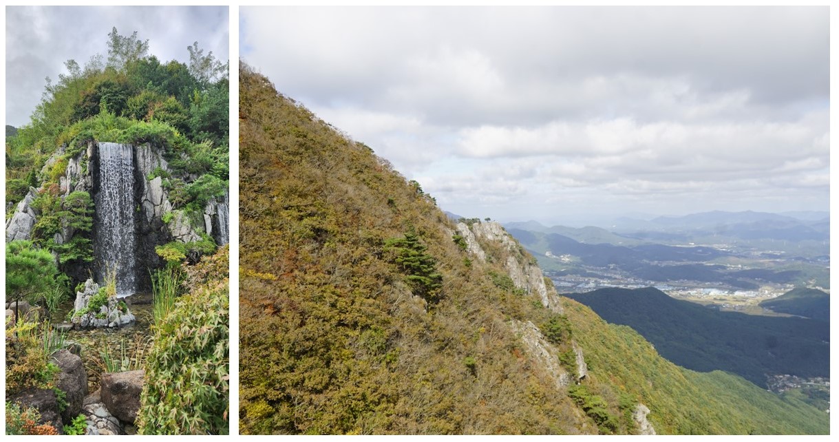 등산로 입구의 폭포와 신월산의 절경 뷰 샷이다.