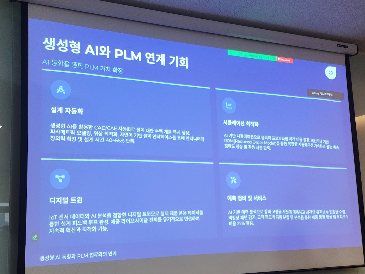 - **류용효 상무(디원)는 최근 급부상 중인 생성형 AI의 동향을 분석하며, PLM 업무와의 접점을 탐구했다. 그는 “생성형 AI는 단순한 도구를 넘어, 설계 아이디어 발상과 업무 자동화를 가속화할 수 있는 촉매제가 될 것”이라고 강조했다.