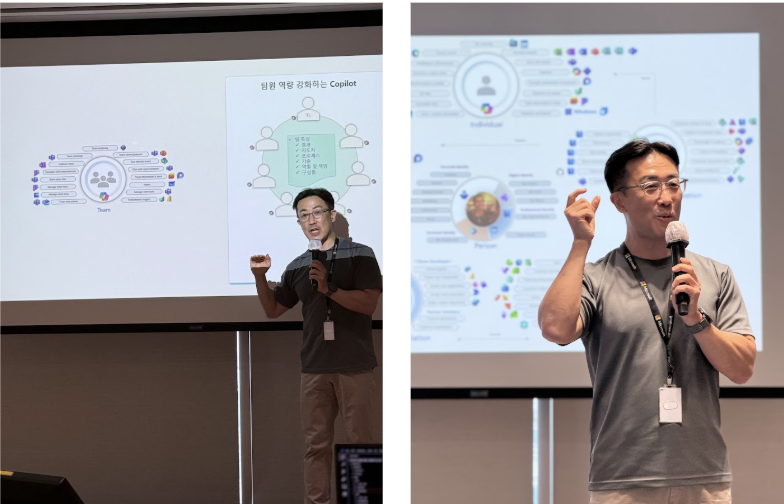 행사 초반, **마이크로소프트의 MOCA(Modern Collaboration Architecture)**가 소개되었다. MOCA는 **‘언제, 어떤 도구를 쓸 것인가’**라는 협업의 본질적 질문에 답하는 모델로, 개인·팀·조직·커뮤니티가 성과를 극대화하도록 돕는 접근법이다. 이를 통해 팀워크 최적화, 리더십 강화, 혁신적 비즈니스 차별화 가능성을 제시했다.