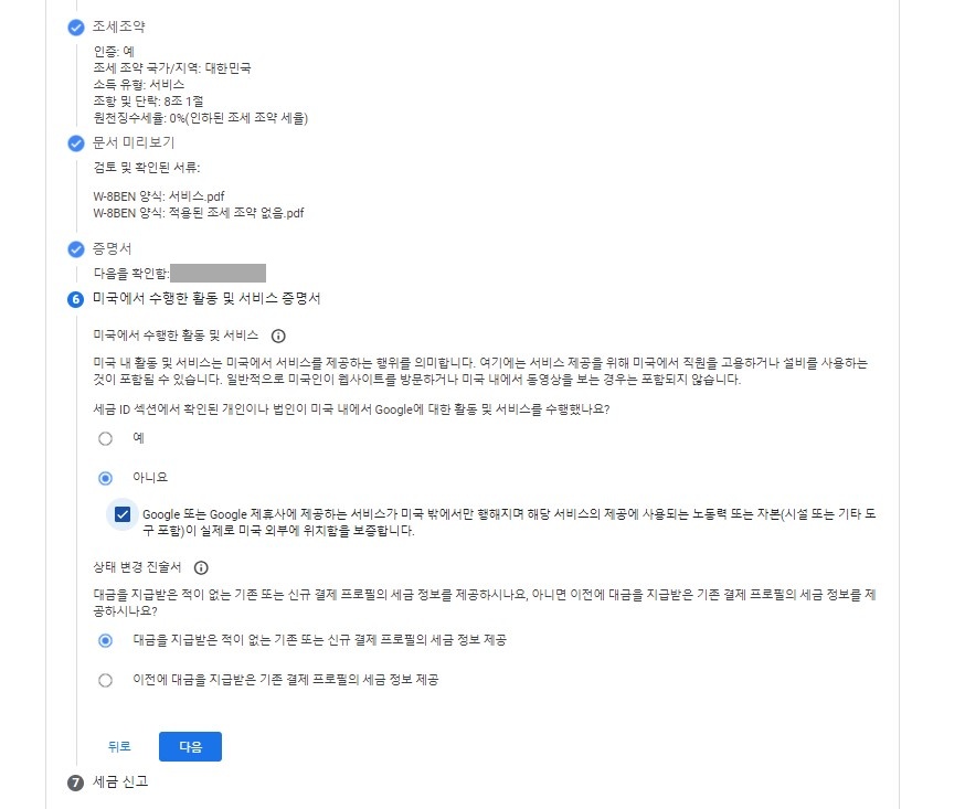 다시 구글 세금 정보 관리 화면으로 돌아가서 진행해 보자.
