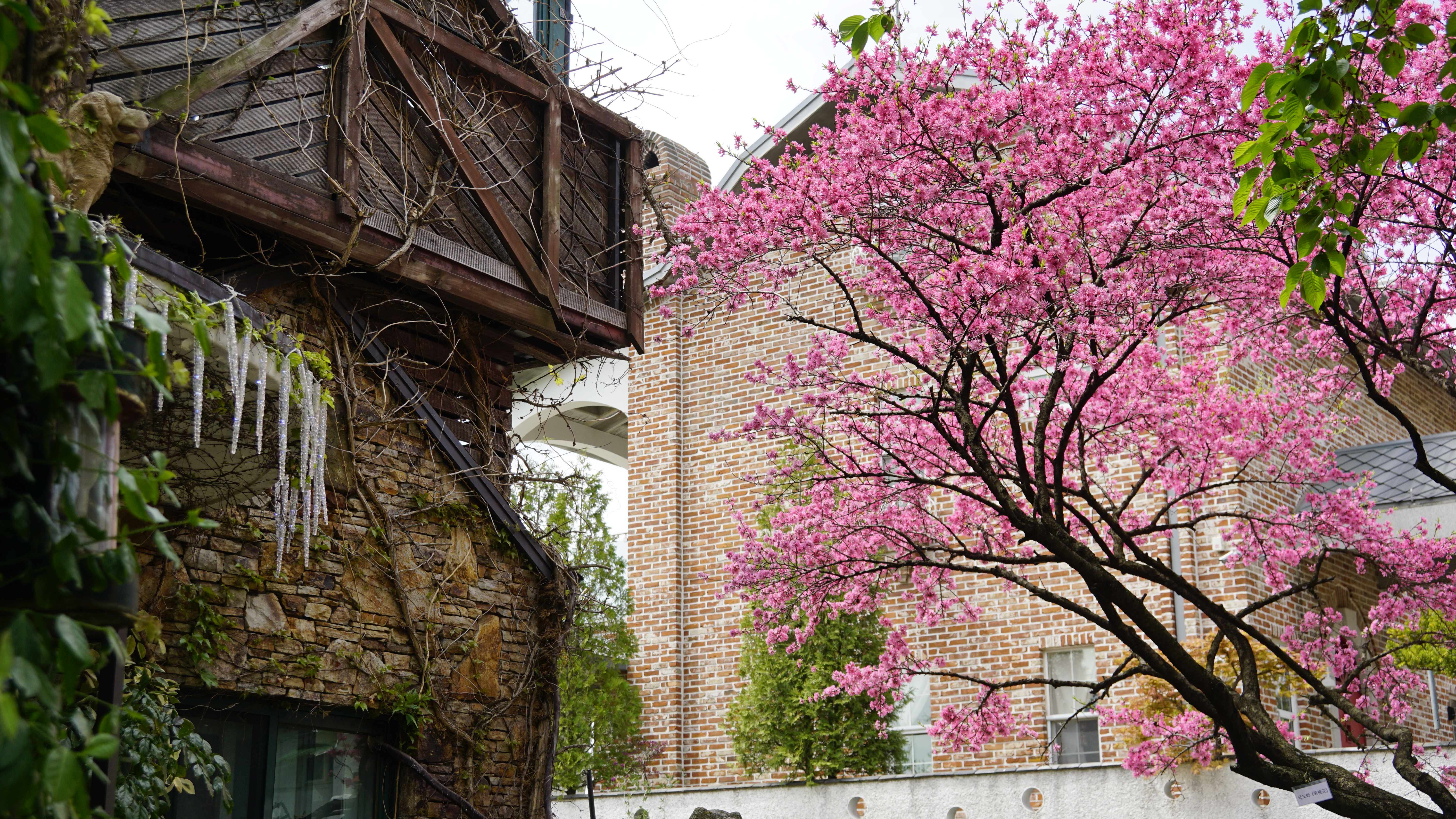 라이락 꽃이 벽화와 더불어 멋지게 반긴다.
