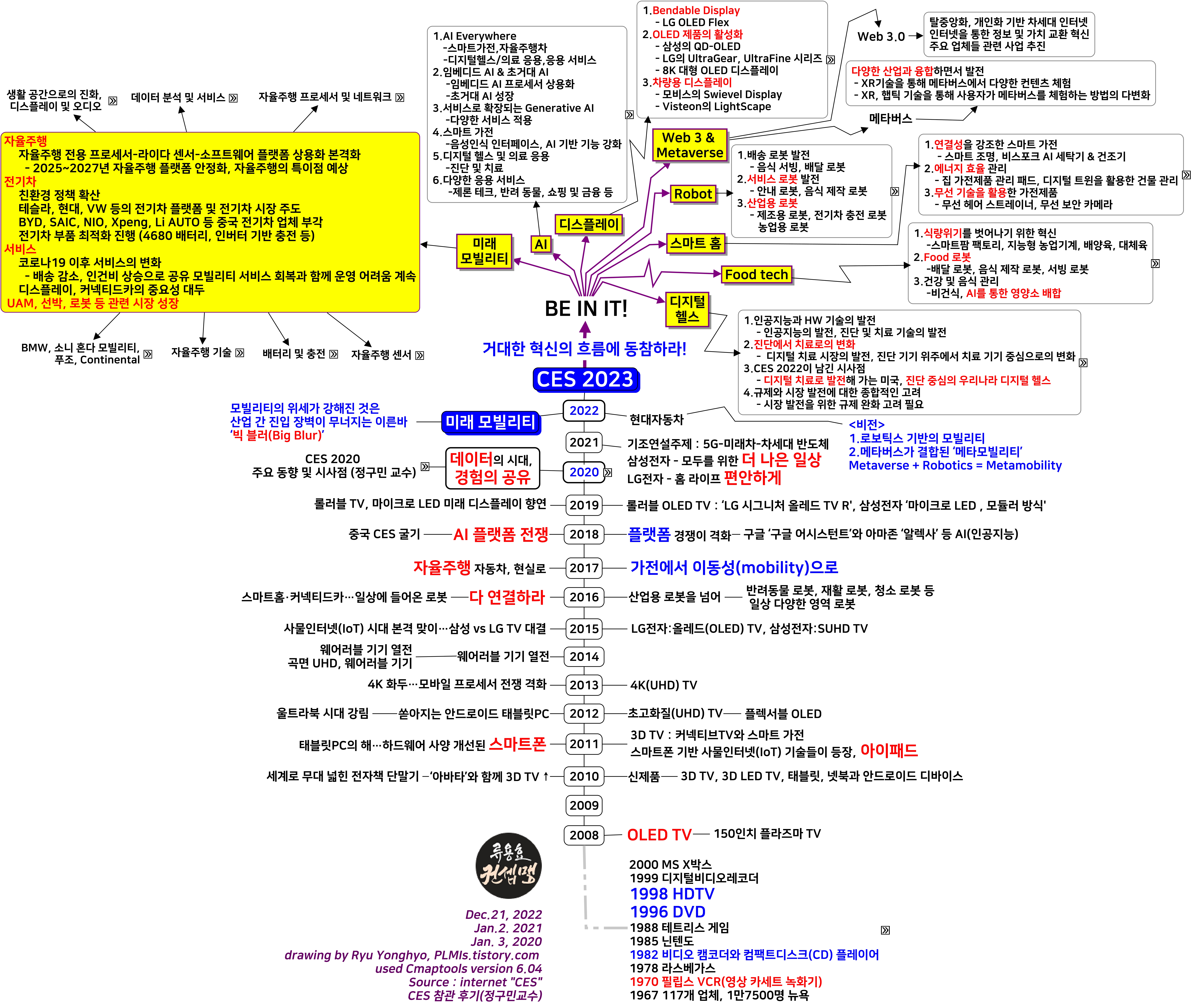 가트너 10대 전략에 이어 CES 2023는 해마다 기술발전의 잣대가 되고 있다. 무엇을 얻는가? 숙성된 기술, 미래가치 천명 등 각 기업들은 기술발전의 우위에 있음을 증명하려고 노력을 한다. 다 연결하라(2016), 가전에서 이동성(Mobility)으로(2017), 그리고 AI 플랫폼 전쟁(2018), 롤로블 OLED TV 시대(2019), 그리고 데이터의 시대, 경험의 공유(2020). 그리고 코로나 시대를 맞았다. 2021년에는 더 나은 일상, 평안하게로 코로나 팬데믹시대를 지나, 2022년에는 미래 모빌리티 시대로 산업간 집입 장벽이 무너지는 ‘빅 블러(Big Blur)’ 였다. 현대자동차는 로보틱스 기반의 모빌리티, 메타버스가 결합된 ‘메타모빌리티’를 비전으로 제시하였다. 그리고 1년후 CES 2023에서의 슬로건은 “BE IN IT!, 거대한 혁신의 흐름에 동참하라!” . 다양한 산업과 융합하면서 발전하는 시대의 원년처럼 보인다. 미래 모빌리티는 자율주행 플랫폼도 상용화를 본격화하고, 전기차 부품 최적화 진행되면서 자율주행기술, 배터리 및 충전기술, 자율주행 센서를 비롯, 자율주행 프로세스 및 네트워크, 데이터 분석 및 서비스의 발전, 그리고 생활 공간으로의 진화가 이어지고 있다.1)